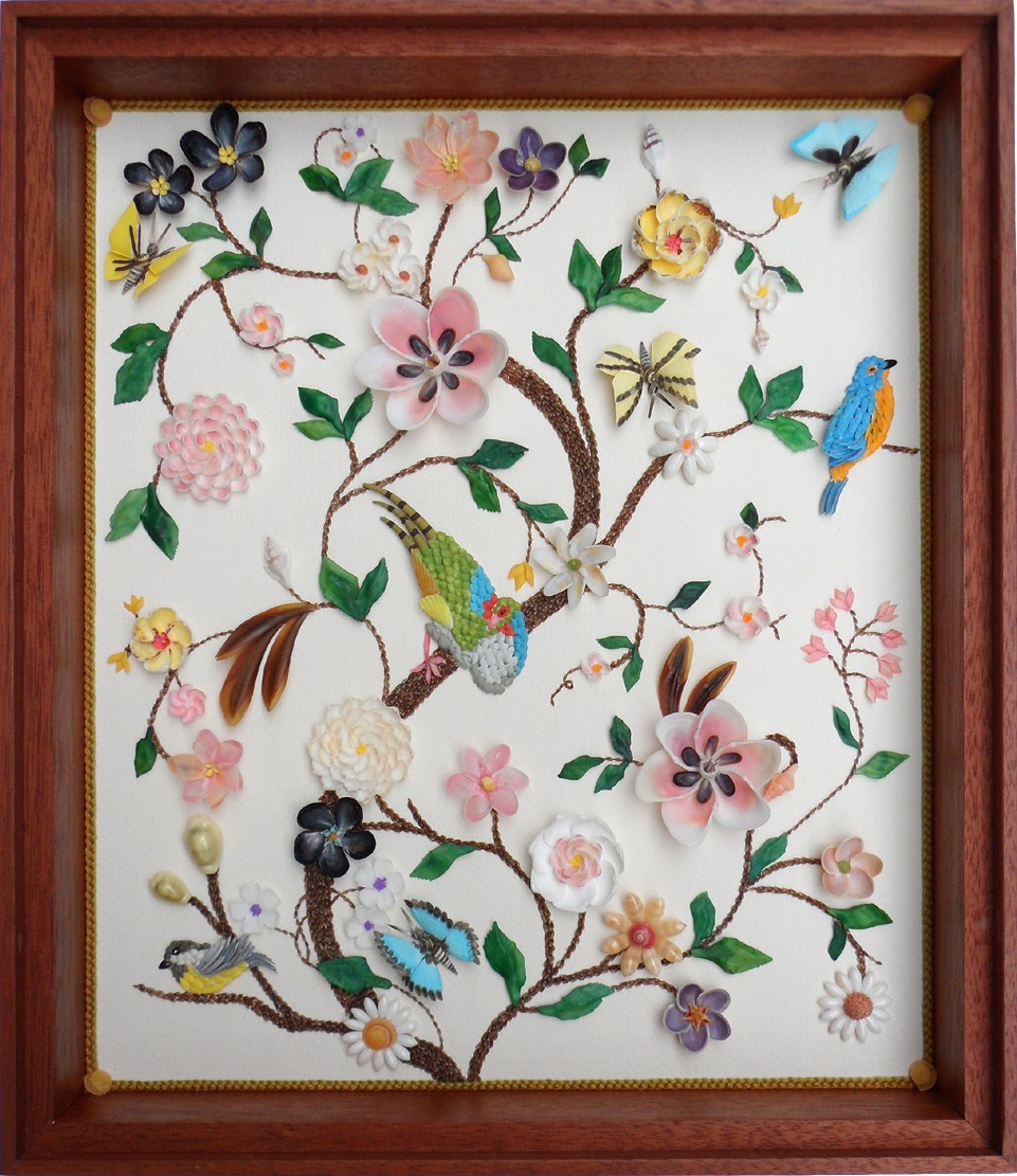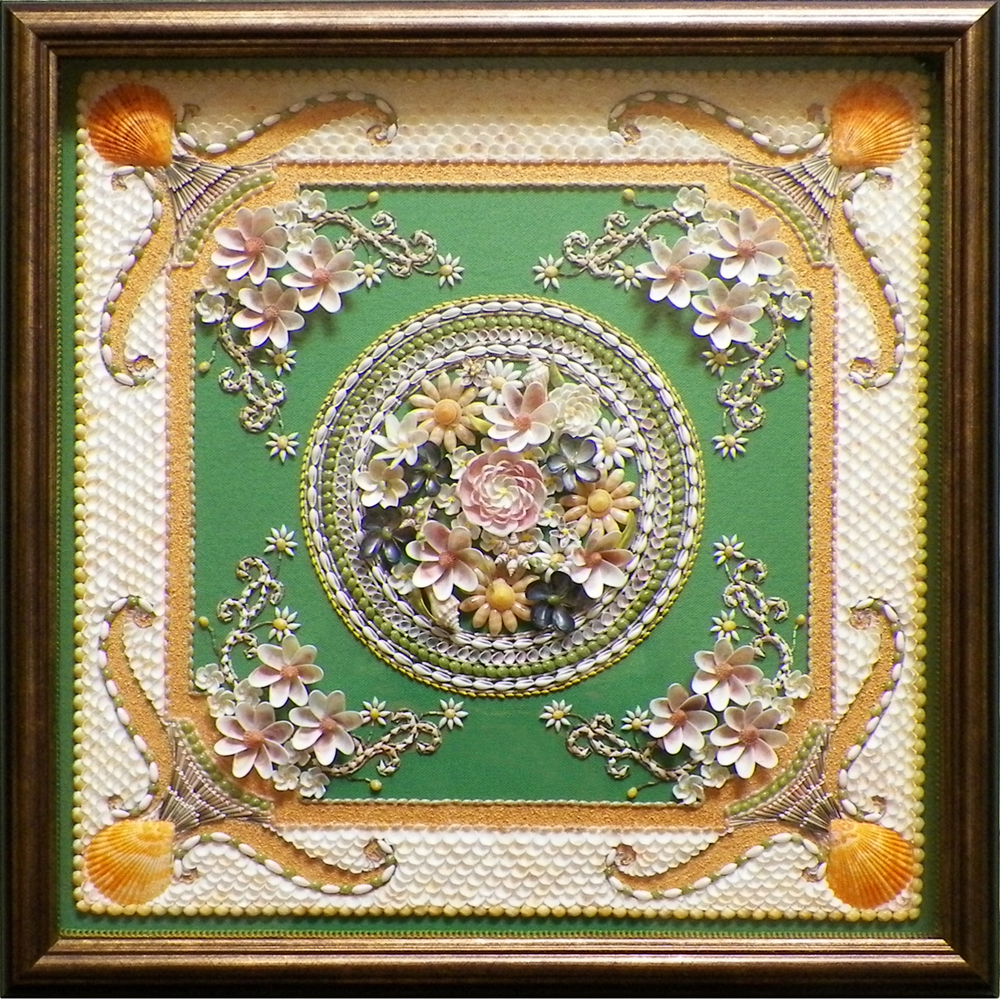 Floral Shell Art Grace Bouquet of Flowers 20″ x 24″ The Lyre of Orpheus 15″ x 21″ Swans II 17″ x 14″ Swans I 17″ x 14″ Spring Flowers 14″ x 14″ In a Garden 15″ x 19″ Nature’s Poetry 14″ x 12″ Victoria 18″x 18″ 12″